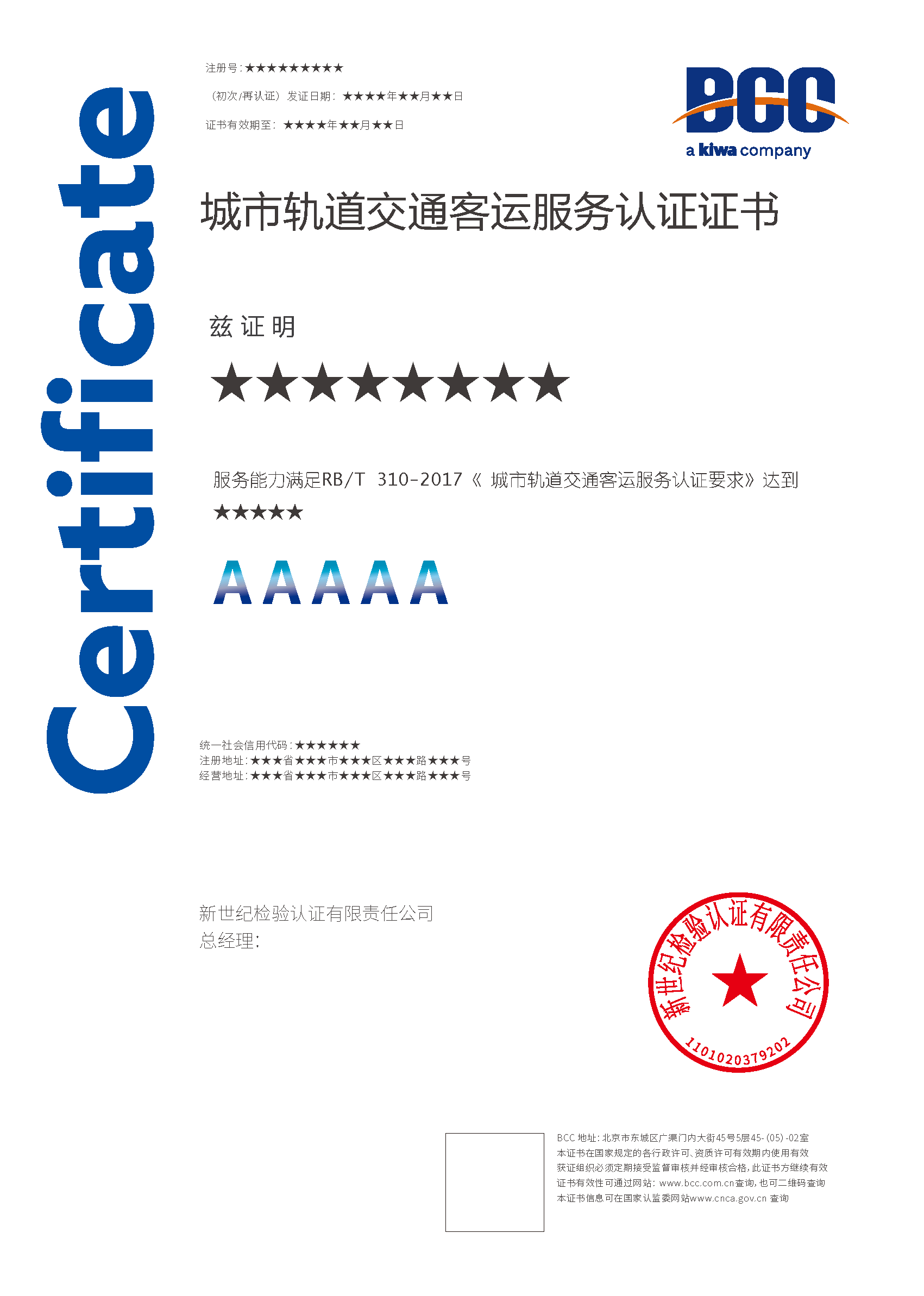 城市軌道交通,是指采用專用軌道導(dǎo)向運行的城市公共客運交通系統(tǒng),包括地鐵系統(tǒng)、輕軌系統(tǒng)、單軌系統(tǒng)、有軌電車、磁浮系統(tǒng)、自動導(dǎo)向軌道系統(tǒng)、市域快速軌道系統(tǒng)。BCC管理人員將會根據(jù)城市軌道交通客運服務(wù)的過程和能力,以及認證周期及不同認證階段,策劃認證模式,通過賦權(quán)量化構(gòu)建的服務(wù)特性體驗測評表計算分值,滿分為100分。具體為:站外信息查詢服務(wù)(18分)、入站導(dǎo)乘服務(wù)(20分)、安檢服務(wù)(4.5分)、票務(wù)服務(wù)(17.5分)、乘車服務(wù)(28分)、換乘和出站導(dǎo)乘服務(wù)(12分)。服務(wù)認證結(jié)果的排序,通常從低至高,即由A至AAAAA級,分為5個等級。