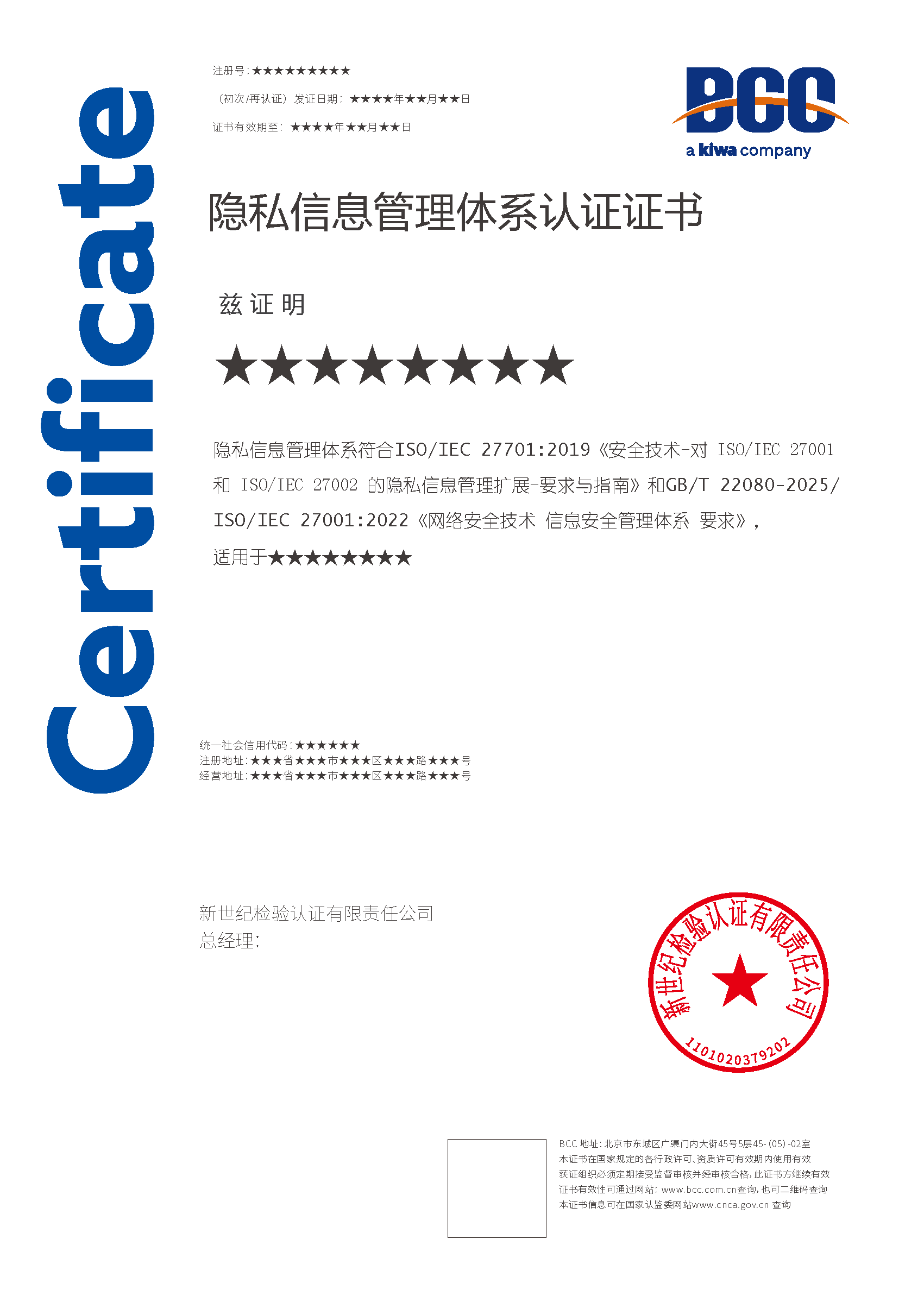 本頁涉及的認(rèn)證服務(wù)中均有對(duì)應(yīng)的《認(rèn)證實(shí)施規(guī)則》,BCC擁有其最終解釋權(quán)。任何組織及個(gè)人未經(jīng)BCC許可,不得以任何形式全部或部分使用(法律要求除外)認(rèn)證相關(guān)信息。如需獲取相關(guān)實(shí)施規(guī)則請(qǐng)用以下方式聯(lián)系獲?。弘娫挘?10-58579316 郵箱:fwjs@kiwa.cn