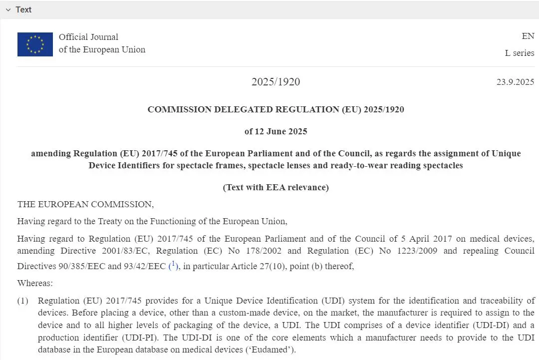 近日,歐盟官方期刊(OJ EU)發(fā)布了《歐盟委員會授權(quán)法規(guī)(EU)2025/1920》,對《醫(yī)療器械法規(guī) (EU) 2017/745》(MDR)中關(guān)于眼鏡框架、眼鏡鏡片和即戴式老花鏡的唯一器械標識(UDI)要求進行了重要修訂。