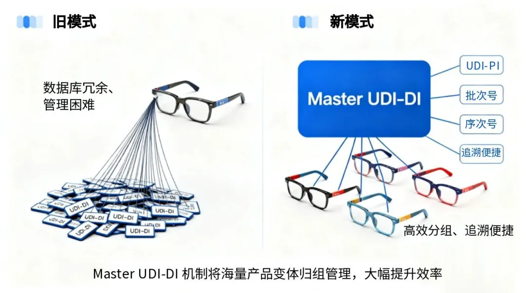 然而,眼鏡框架、眼鏡鏡片和即戴式老花鏡等產(chǎn)品由于存在大量的設(shè)計參數(shù)和結(jié)構(gòu)變體,同一型號下可能衍生出海量UDI-DI。按照原有規(guī)則,每個產(chǎn)品變體都需單獨分配 UDI-DI,導致同類眼鏡產(chǎn)品的 UDI-DI 數(shù)量激增。