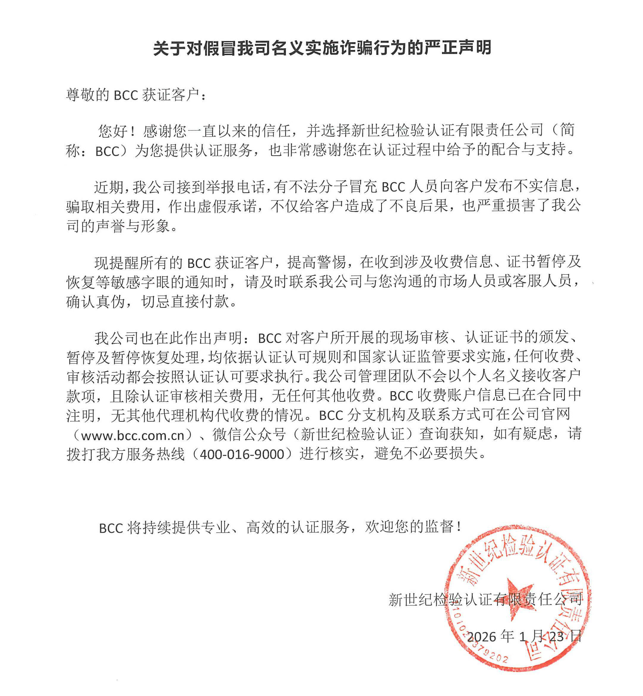您好!感謝您一直以來(lái)的信任,并選擇新世紀(jì)檢驗(yàn)認(rèn)證有限責(zé)任公司(簡(jiǎn)稱(chēng):BCC)為您提供認(rèn)證服務(wù),也非常感謝您在認(rèn)證過(guò)程中給予的配合與支持。