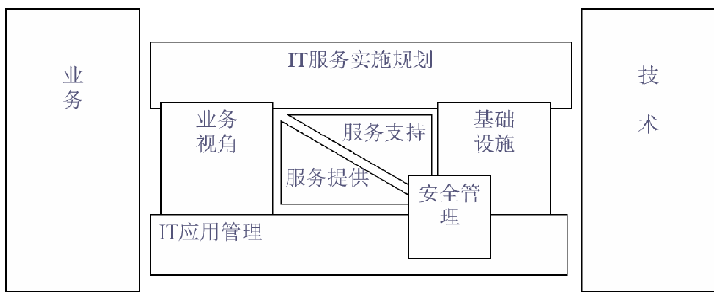 IT 服務(wù)實施規(guī)劃處于整個結(jié)構(gòu)的最高層,功能是對框架內(nèi) 6 大模塊開展各項工作進行指導(dǎo),幫助用戶分析現(xiàn)有情況,協(xié)助設(shè)定發(fā)展戰(zhàn)略與目標(biāo),同時在實踐中對完成的工作進行評測,給出調(diào)整意見。