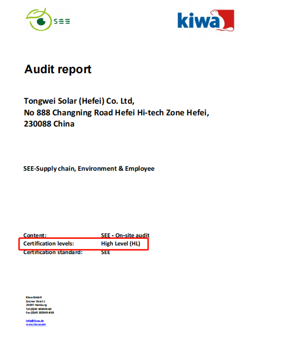 作為全球認證領域20強企業(yè),Kiwa集團專家與Kiwa BCC專家對企業(yè)進行了現場審核、通過員工訪談,以及文件評審等工作,最終為通威太陽能頒發(fā)了首份依據SEE標準的ESG現場評估報告,并高度評價了通威太陽能在ESG管理方面的突出表現。報告涵蓋可持續(xù)的企業(yè)治理、供應鏈管理、員工權益、環(huán)境管理四個部分,總計約50個主題,在全球范圍內有著較高且廣泛的客戶接受度和權威公信力。